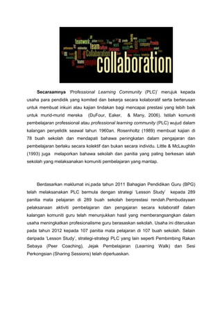 DuFour Eaker Many 2006 PLC 2014 10 DEFINISIDEFINISI PLCPLC. Cabaran dalam kekangan masa bagi program sekolah kursus. PLC adalah singkatan kepada program Profesional Learning Communities yang merujuk kepada para pendidik yang komited dan bekerja secara kolaboratif serta berterusan dalam usaha membuat inkuiri atau kajian tindakan untuk mencapai prestasi yang lebih baik untuk murid-murid mereka Rosenholtz 1989.